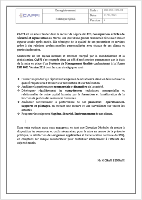 Consciente de ses enjeux internes et externes marqué par la mondialisation et la globalisation, CAPFI s’est engagée dans un défi d’amélioration permanente par le biais de la mise en place d’un Système de Management Qualité conformément à la Norme ISO 9001 Version 2015 dont les axes stratégiques sont :